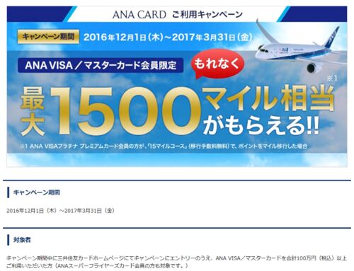ANA VISA/マスターカードで、もれなく1,500マイル相当のワールドプレゼントポイントがもらえるキャンペーンが始まっていたようです。 期間は昨年の12/1から3/31まで。 条件は、三井住友カードのHP(VPASS)でキャンペーンのエントリーをして、合計100万円(…